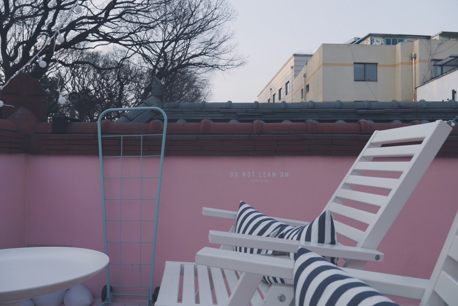 夏威夷度假風的粉紅屋頂和度假風的躺椅真是絕配,昌慶宮及宗廟和這裡只隔一條小巷子,坐在頂樓就能遠眺以前朝鮮時代大王太妃的居所,韓國古蹟和粉紅少女咖啡廳相遇也不會有違和感,反而增添的一些趣味感,看著照片心情也雀躍了起來。