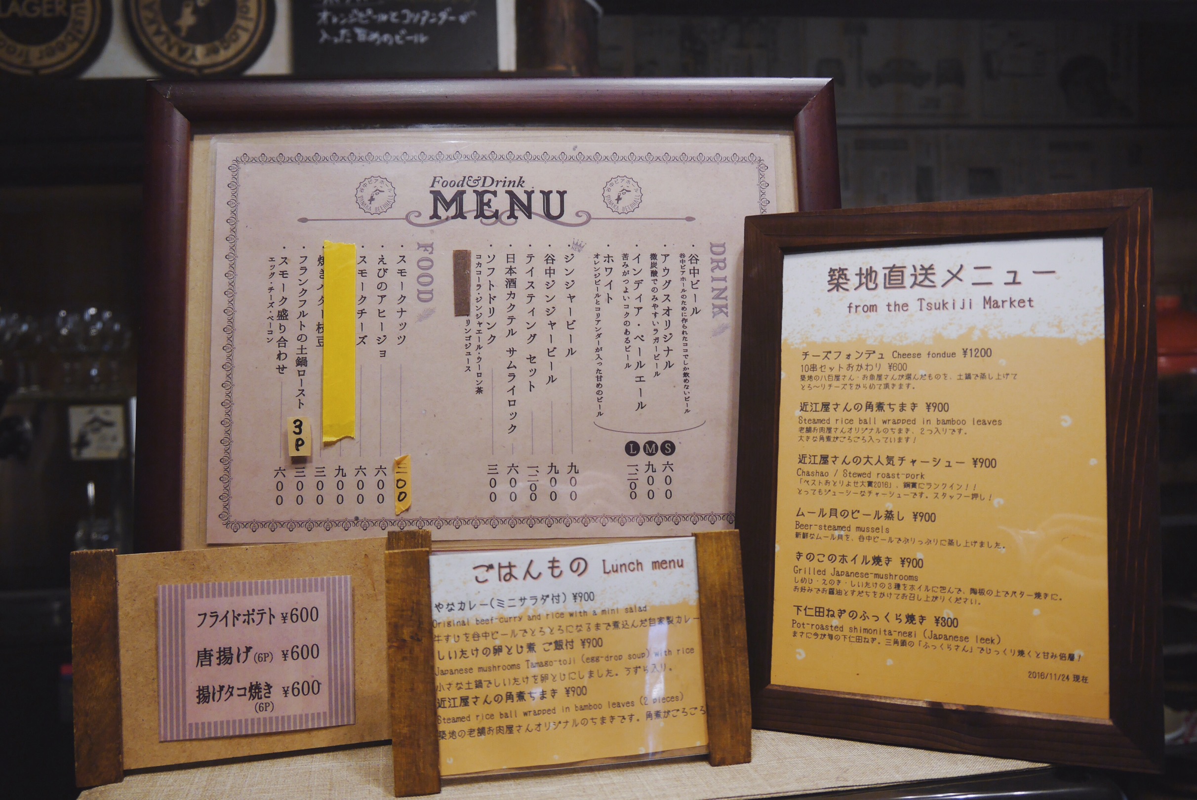 到櫃檯點餐時發現桌上擺滿了土鍋,這裡最有人氣的料理就是用土鍋悶煮出來的煙燻小菜組,充滿懷舊滋味的煙燻起司、厚培根和蛋,濃厚棕色的外表也完全融入老屋的氛圍中。我們各點了一杯「谷中自家製薑汁啤酒(谷中ジンジャービール)」和小鹹食(MENU圖)。