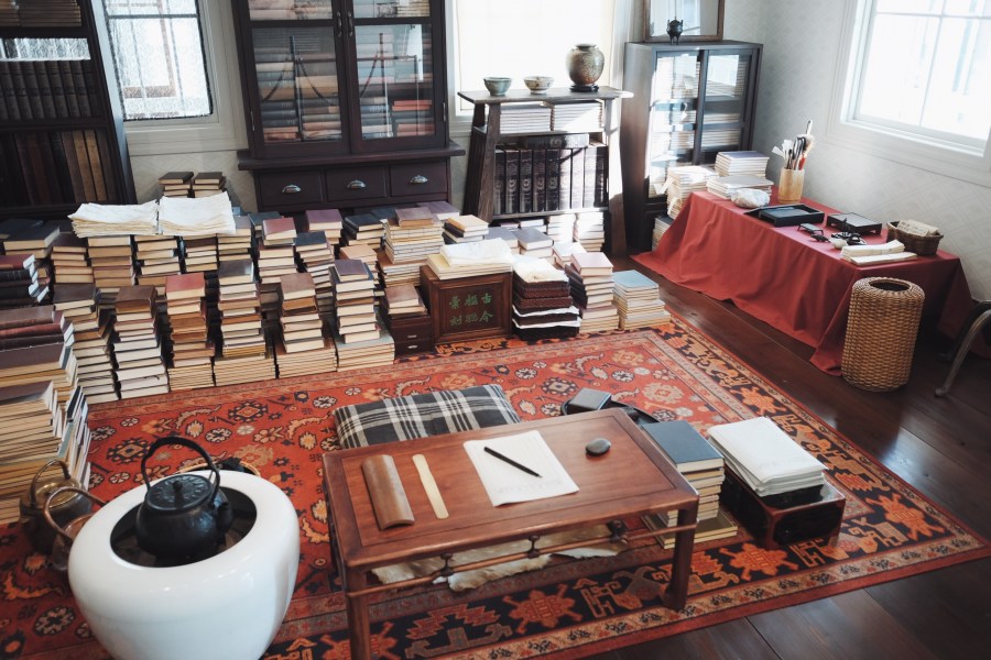購買門票(300日圓)進入館內後,首先映入眼簾的是一樓空間,中央的書齋是以漱石晚年的書齋為原型,重現的矮桌、書櫃、地毯到堆疊的書籍無不逼真,此書齋也是當年漱石與弟子每週四舉辦文學交流會「木曜會」之場所。靜靜凝望著書齋細節後,總讓人忍不住想像起種種歷史場景,我則被骨董地毯的那抹紅所深深吸引。