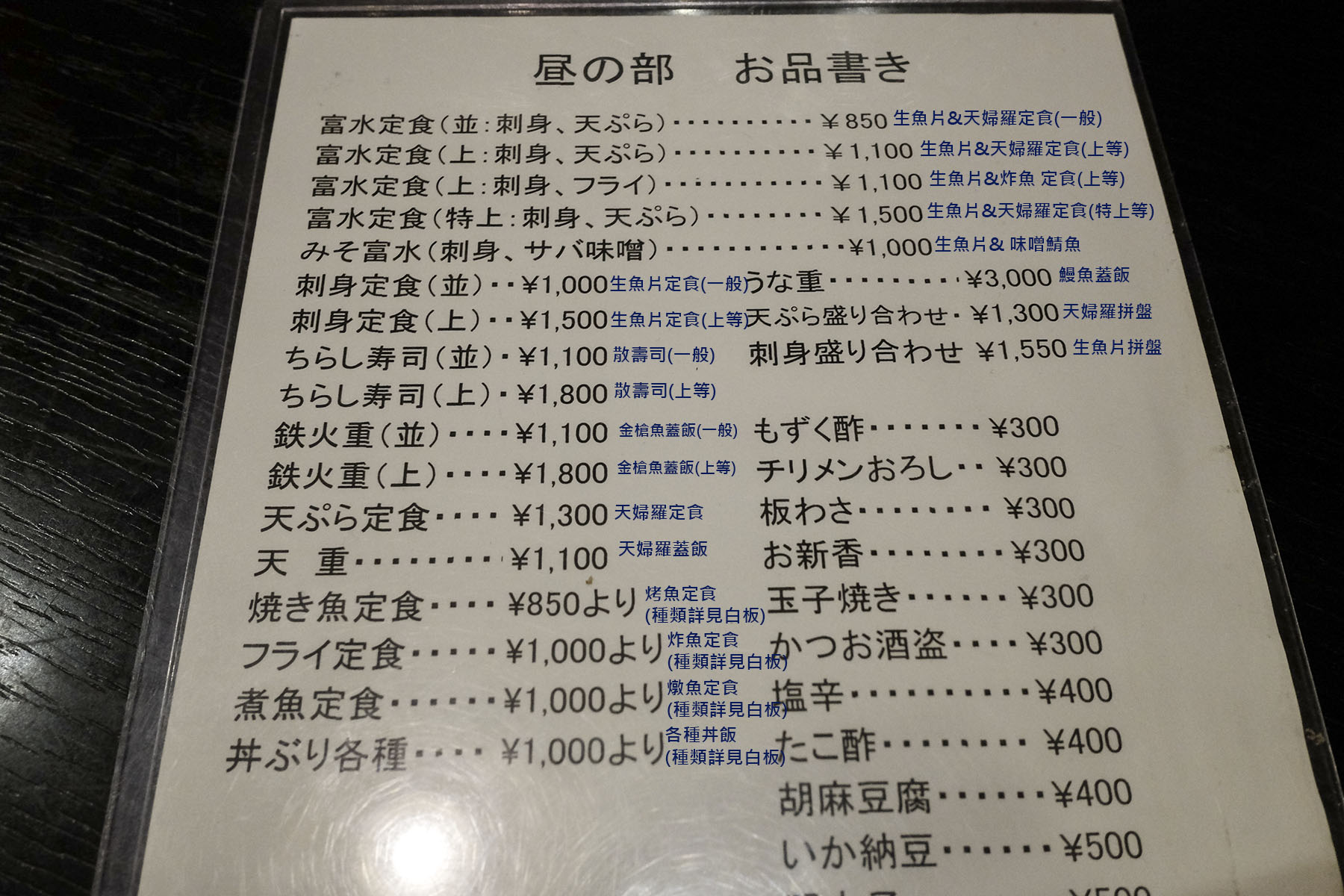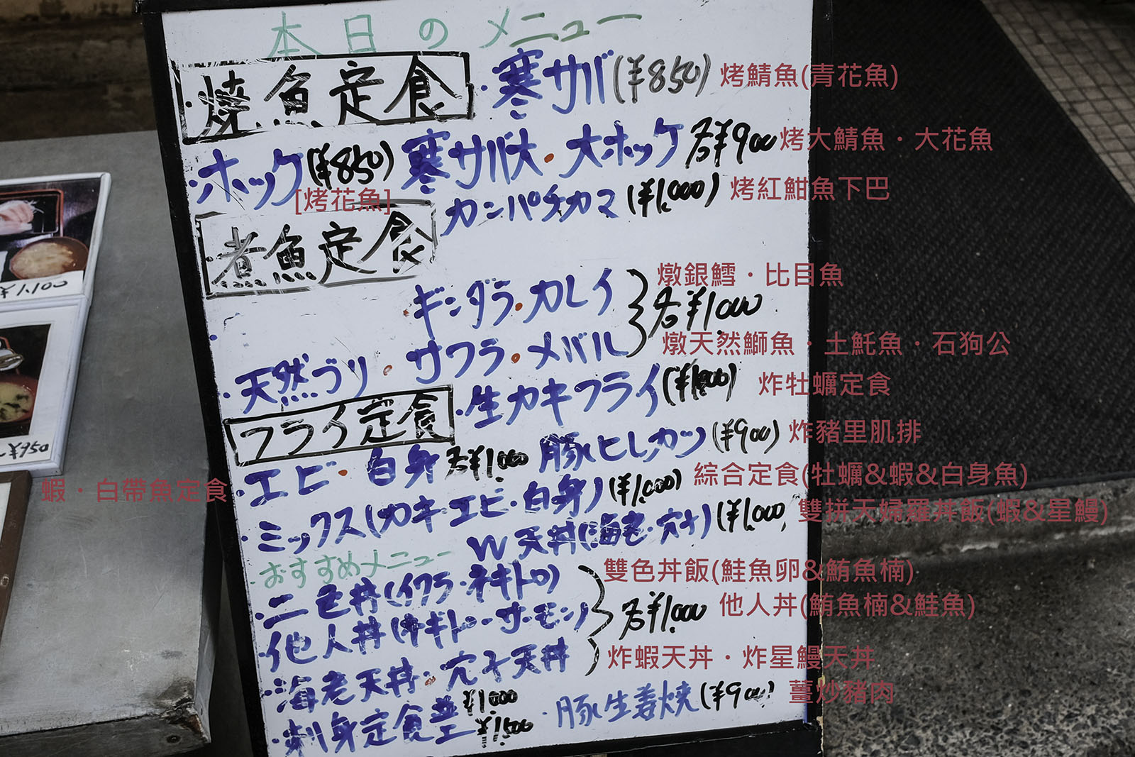 這是一間深受上班族喜愛的庶民食堂,裡面的菜單也只有日文,而且當日餐點只寫在小白板上,如果看不懂魚類名字的話會有點茫然,所以我就簡單翻譯一下定食菜單和當天白板上的餐點(說是簡單翻譯但魚類名稱真是讓人頭痛…),上圖則是那天點的「他人丼」,裡頭的鮭魚和鮪魚泥都相當新鮮美味。