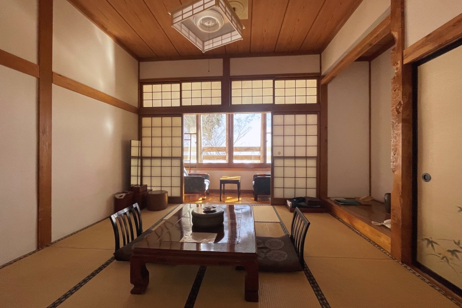接下來看看本陣之外的房型吧!與一號館相連的「東本陣」住宿棟,裡頭也有一些房間有附圍爐裏,房客都可以在房間享用晚餐,含早晚餐一人約14.450日圓,房內也有緣側休憩區和獨立洗手間,是經典的和室房間類型。