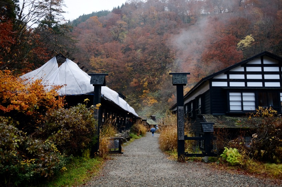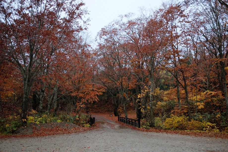 東北地區的秋末11月初,第一次到訪乳頭溫泉鄉,從田澤湖站前往乳頭山的路上,沿途的山毛欅(ぶな)直直佇立在道路兩側,紛紛轉黃橘的多變楓紅,隨著細雨的來臨添上一點灰黑色調。被雨打落的紅葉散落一地,吸引著旅人繼續開車前進。