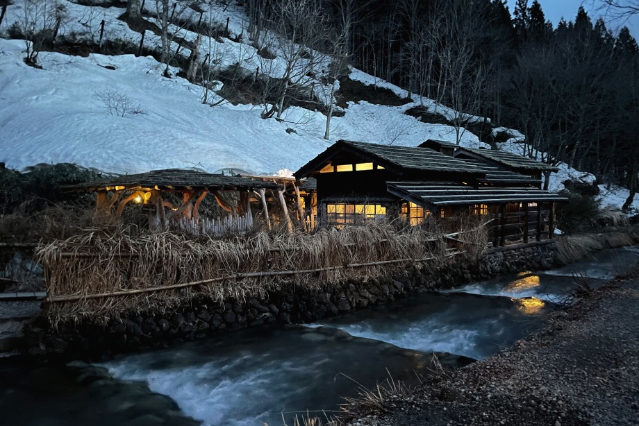 冬末二訪鶴之湯溫泉,沿途的樹上還有一點殘雪。傍晚過後的鶴之湯溫泉點上燈火,細流水聲和天空轉黑前的藍色調,更添秋田秘湯的夢幻風情。