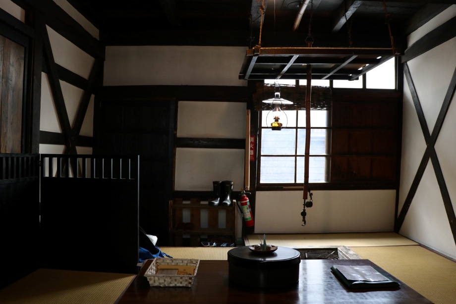 當天入住本陣二號房,房間裡頭有專屬的圍爐裏、油燈和洗手間,照片左側木頭色的牆面,是一道可以開啟的木門,也是過去曾與其他房間相連的證明(現已上鎖)。比較特別的是,本陣房間保留如初,這裡的房門沒有鑰匙可以上鎖,只能用長長的木頭從內側卡在牆與門之間。